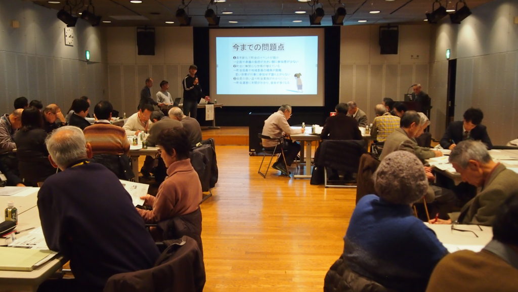 第9回町会等情報交換会(2018年度)がアミュゼ柏で、町会・自治会等役員など40名を超える参加者で開催されました。「町会運営のスマート化を目指して」をテーマに、三俣町会の牛島会長、北柏町会の小齋副会長の事例発表と参加者同士によるグループディスカッションを行い、スマート化による町会等運営の負担軽減等について討議を行いました。